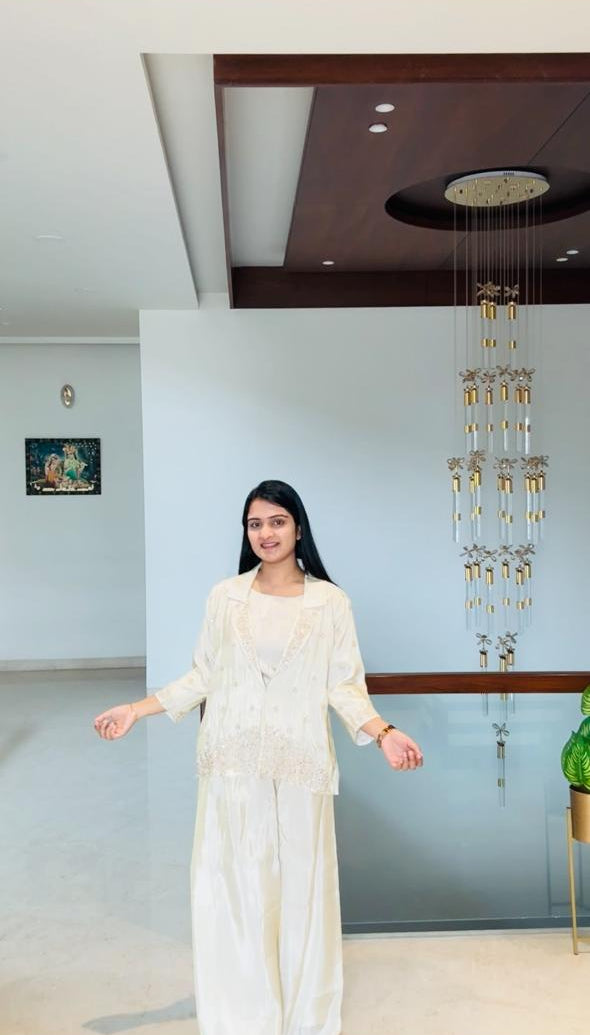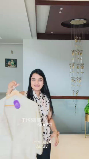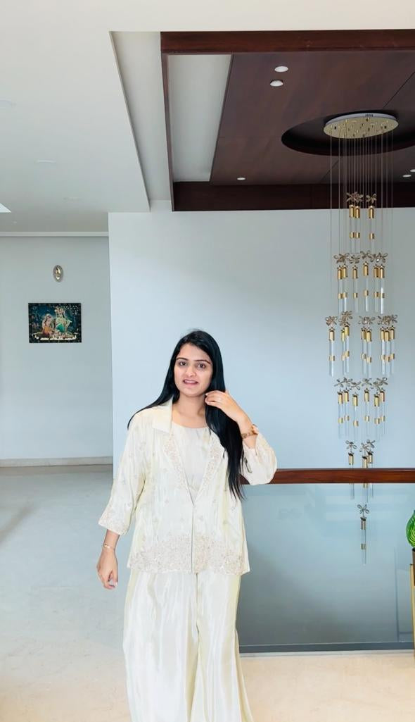 Designed in luxurious tissue fabric, this set features:A soft inner, delicately detailed jacket, flowy sharara that adds graceful movement.