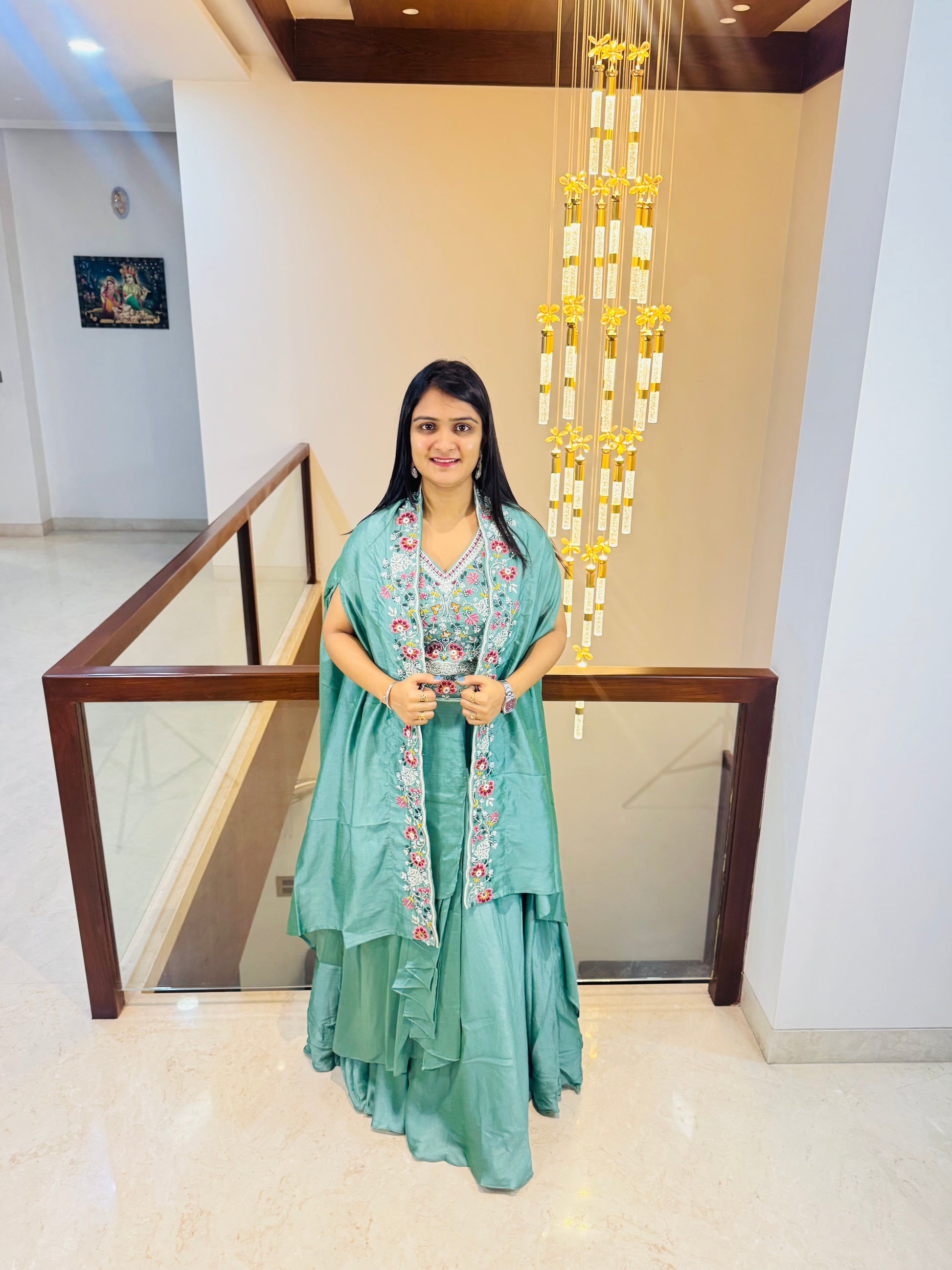 Crafted in luxurious pure Chinon fabric, this mint green Indo Western set features a beautifully embroidered jacket paired with a flowy layered skirt. Adorned with floral thread and sequin detailing, it blends traditional elegance with modern flair perfect for festive soirées and wedding celebrations.