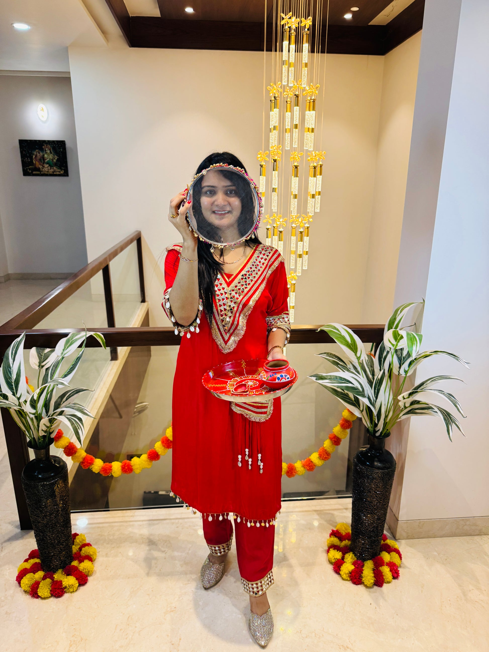 Step into timeless grace with this pure crepe silk red set, beautifully adorned with intricate mirror work and delicate cowrie shell embellishments. The V-neckline and sleeve edges shimmer with fine detailing, while playful shell tassels add a festive charm. Paired with straight pants featuring coordinated mirror accents, this set blends luxury and comfort.
